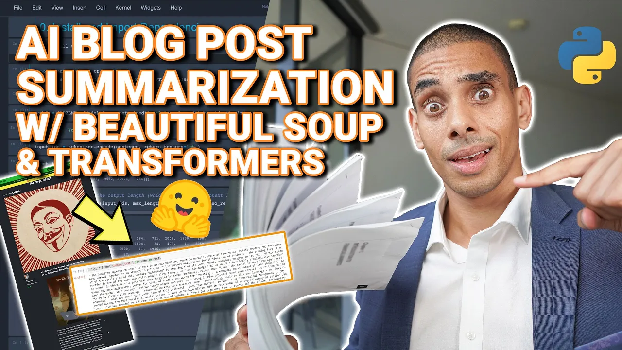 nick i'm going to need a summary of these papers for the japan report by close of business today uh there's like 500 pages here perfect thanks knew i could count on you we're gonna need some help luckily we can use hugging face transformers for ai based summarization let's do it tired of reading a ton of blog posts well in this video we're going to be taking a look at how we can use ai to summarize long blog posts so for this we're going to be using hugging face and a number of natural language processing techniques let's take a deeper look as to what we're going to be going through so in order to summarize our blog post we're going to be using a library called transformers by a group called hugging face and specifically we're going to be using their summarization pipelines capability so this allows you to pass your blocker text and have it summarize now because there is a bit of a limit on that pipeline what we need to do is a little bit of processing in order to be able to handle larger blog posts but we'll go through that really really easily so in terms of what we're going to be covering in this video we're going to be setting up hugging face transformers then we're going to actually use beautiful soup to be able to scrape blog posts off the internet so you don't need to copy and paste them we'll be able to scrape them down and use them for our summarization then what we'll do is we'll chunk them into blocks of sentences and pass them to our summarizer in order to generate our summary then we'll be able to export this out to a text file so we can actually go on ahead and read it and use it wherever we need to let's take a look at how this is all going to fit together so first up what we're going to be doing is installing hugging face transformers so this is going to give us a whole bunch of natural language processing capability then what we're going to do is we're going to scrape a blog post from the web using beautiful soup and i think we might take a look at hackernoon and towards data science just as some examples then what we'll do is using that text that we've managed to grab we'll chunk that into sentences and then pass it through to our summarization model in order to generate our summary then we'll push it out to a text file so we can play around with it and post it wherever we need to ready to do it let's get to it alrighty so in order to summarize our blog post we need to go through six key steps so first up what we need to do is install transformers and import a bunch of dependencies then what we're going to do is load our summarization pipeline we're then going to go on ahead and get a blog post from medium so what we'll actually do is we'll use beautiful soup to actually pull down a blog post pre-process that and allow us to actually pass that to our summarization pipeline but before we actually get to that what we're actually going to do is we're going to chunk our text into blocks and the reason that we do this is because there is a limit as to how much text we can pass to our baseline summarization pipeline there are other models that can handle a whole bunch of additional text but the problem with some of these sometimes is that you need quite a fair bit of memory on your gpu a lot of which isn't actually very commercially viable for a lot of users so what we're going to do is rather than having to go and spend thousands of bucks on a gpu we're going to chunk up our text and summarize it in blocks and then last but not least we're going to output to our text file so in order to do this we're going to be using the transformers pipeline and specifically we're going to be loading the summarization pipeline which you can see over here now you can go through a really simple example and really just load that pipeline and then summarize like that and it's quite quick right but in this case what we're going to do is build out a fully fleshed example if you want to see a quick run through i'll include a link to a video that we did on short summarization somewhere above and in the description below and as always all the code for this video is going to be available via github so if you want to pick this up and just run with it really quickly you can actually go to github. com forward slash long form summarize a long form dash summarization dash with hugging face and you should be able to get this entire notebook available pretty easily but as always we're going to go through this step by step and actually take a look at how it's done now also another thing to note whilst we're doing this on blog posts you could do this on a whole bunch of other different types of text if you wanted to so if you wanted to summarize research papers or newspaper articles you could definitely do that as well alrighty on to step one so first up what we're going to do is install our core dependency which is going to be transformers so let's go ahead and do it alrighty so that's our installation done so in order to do that what we've written is exclamation mark pip install transformers so this is going to go on ahead and install the transformers library into our python environment so we've now got that available now the next thing that we need to do is actually go ahead and import our dependency so let's go ahead and do that alrighty so we've gone and written three lines of code there to import our dependencies now the first line is importing transformers so what we've written is from transformers import pipeline and the pipeline is going to allow us to import our summarization model really easily then the second line that we've written is from bs4 import beautiful suit so beautiful soup is a library that allows us to easily perform web scraping so the reason that we're importing beautiful soup is that we're actually going to go on ahead and programmatically grab a blog post from the web bring it down and then actually work with it in python so we don't need to do any copying and pasting we're just g