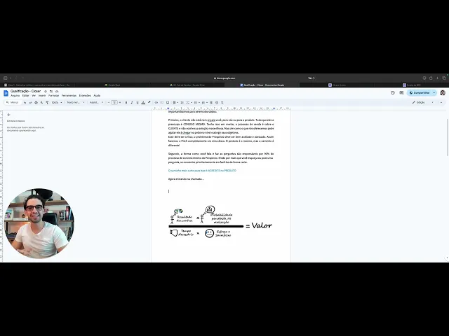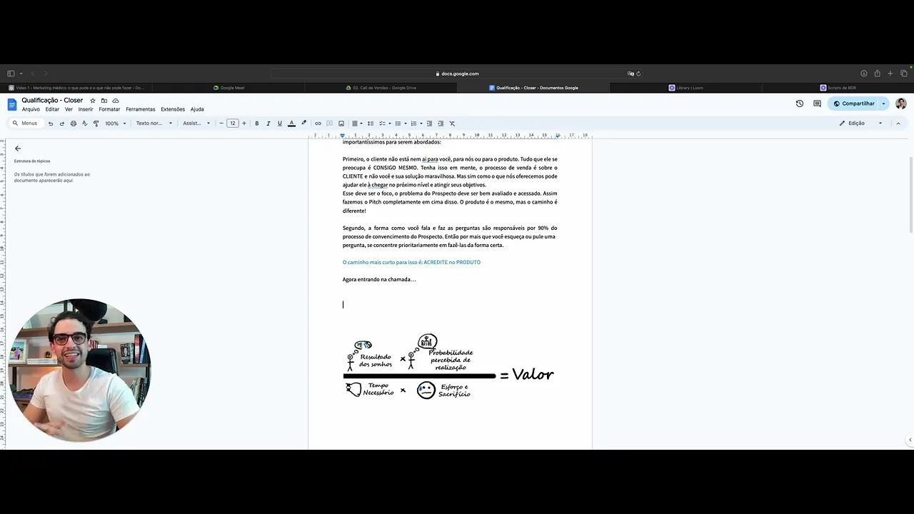 Chegamos na parte que todo mundo gosta a parte de closer fechamento Mas uma coisa importante para vocês aqui não negligencia a parte de prospecção tá quando a gente for falar da nossa Call de vendas na estrutura da B2 como é que ela funciona geralmente Nós temos dois momentos na col de vendas como vocês viram pela análise de Pit lá no na par 00er nós temos uma primeira parte em que nós falaremos e faremos uma nova qualificação para eu saber se esse Lead que chegou que era mql ou seja pelo mar n marketing qualifi se ele é um s se ele é Sales qualified ou seja se ele é uma pessoa que tem dinheiro para pagar pela solução pode se beneficiar da nossa da nossa empresa e é uma pessoa que é tomadora de decisão é uma pessoa que tem uma ador tem dinheiro e é o tomador de decisão porque eu não tô vendendo né então Claro a não ser que seja um perfil comal ruim a pessoa maluca en Mas se não for oo é uma pesso que L né qualificado então quando a gente chega aqui nós temos alguns momentos a gente tem a parte eh do Pit comercial efetivamente né onde Nós faremos a venda do produto nós temos uma parte que antecede isso que é uma qualificação e temos ainda mesmo uma parte que antecede isso tudo que é aquela aula onde eu mostro para você aquela pré-avaliação que eu faço do Lead que eu envio para ele então antes de eu chegar na có de vendas Eu preciso estudar quem eu Lead nem que seja de forma superficial C minutin Ant entra no Instagram da pessoa vê como é que ele se posiciona até para você não ficar fazendo pergunta boba estuda 5 minutos antes esse é o momento zero depois a gente vai fazer uma parte de qualificação aí vocês terão algumas coisas deixa eu até separar isso aqui eh deixa eu criar aqui uma pasta deixa eu deixar aqui uma pasta de planilhas e dentro dessa pasta de planilhas vai ter a planilha de vendas efetivamente vai ter a nossa tabela de planos né aqui Vocês verão que na parte de qualificação vocês terão duas opções vocês terão a opção da nossa eh nosso nosso roteiro de venda 6. 0 esse 6. 0 aqui a sexta versão dele ele é levemente diferente desse aqui que tá como qualificação eu prefiro utilizar esse de qualificação Qual é a coisa mais importante e e por eu modifiquei isso uma cois importante para vocês terem em mente tudo que o cliente se se preocupa é com ele mesmo absorve isso aí absorve Não interessa quem você é o que você já fez quantos clientes você já atendeu o que que você faz da su vida como é seu nome não interessa nada disso ele quer saber se você vai resolver o problema dele é isso negão é isso então por que você precisa ter isso em mente porque aí você não perde tempo falando de você o tempo todo da call você tá falando sobre o cliente não sobre você não interessa o quão bom sua solução é ou você foi para rard não interessa velho ele só quer saber se você foi para rard porque se você foi para Harvard a probabilidade de você resolver o problema dele é maior o que faz um cliente comprar né isso quem fala é o Alex ormos e o que faz o cliente comprar é uma equação entre o quanto vai custar né e do outro lado você tem qual é a probabilidade de sucesso quanto maior probabilidade mais ele paga quanto de esforço o cliente terá quanto menos esforço ele vai ter para chegar no resultado mais ele paga eu até busquei aqui a equação para deixar aqui bonitinho para vocês que é isso aqui ó o que faz um cliente comprar é que é o valor né o quanto ele vai pagar pela solução quanto maior for o sonho ou seja quanto mais você puder entregar mais ele paga quanto maior for a probabilidade de sucesso que ele percebe Não é que você diz que ele percebe mais ele paga quanto mais tempo demora para essa pessoa chegar nesse resultado menos ele paga e quanto mais ele terá que se esforçar o Lead o cliente quanto mais ele tem que se esforçar menos ele paga se eu tenho algo que vai levar ele pra lua que tem 100% de de dar certo né que vai demorar 5 segundos e que ele não vai ter que fazer absolutamente nada esse cara vai pagar a lua menos 5% para você né ele vai L pagar caro agora se for algo por exemplo aqui é a questão da academia da bariátrica Barca esforço zero alta probabilidade dar certo pouco tempo uma cirurgia vai ter um tempo de recuperação e vai chegar no resultado que ele queria que é perder peso no caso da academia ele vai perder peso mais saudável mais saudável do que na na bariátrica porque na bariátrica você tá tirando um pedaço considerável de um órgão né vai ficar desabor essa pessoa no entanto eh demora para né para para para você conseguir engatar na academia você tem que se esforçar para caramba né você tem que ir todos os dias cinco vezes na semana três vezes na semana você tem que comer menos do que você gostaria de comer tem que comer menos pizza menos hambúrguer e você não sabe se vai dar certo porque assim se você der uma recaída nesse meio tempo você perde tudo que você acumulou né então por isso que a academia você paga você chia para pagar R 200 de mensalidade e a Bari que você paga r000 é a mesma coisa eu feito essa introdução aqui o que é que eu quero levar para vocês então quando a gente faz essa ligação eu sempre chego para ele e falo assim eu me apresento Me apresento do tipo Olá lid olha meu nome é peredo dó sou seu seu colega médico também sou um dos sócios fundadores da B2 e o objetivo aqui com essa nossa conversa é que ela seja bem tranquila eu quero entender um pouco mais o que te levou a nos buscar entender qual é a tua demanda os teus objetivos e saber se essa tua demanda eu consigo resolver ou não se eu não conseguir resolver eu te direi Se eu conseguir aí a gente progride nossa conversa faz sentido a pessoa te diz sim e aí pronto você começa perguntando sobre o que trouxe essa pessoa até aqui primeira pergunta importantíssima Fulano Você separou um pedaço da