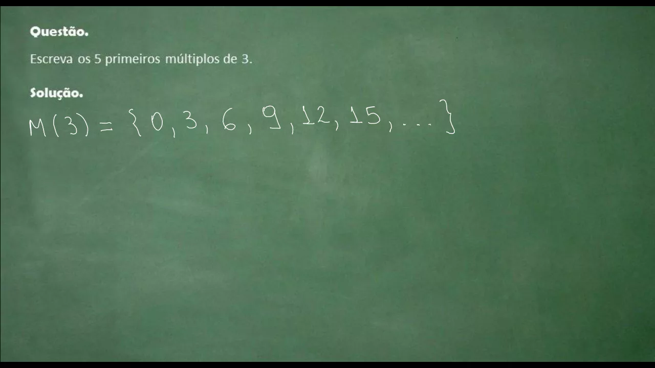 olá bem vindos à resolução de mais uma questão sobre múltiplos e divisores nossa questão agora é a seguinte escreva os cinco primeiros múltiplos de 3 vamos a resolução lembrando que pela definição de múltiplos o número é múltiplo do outro se existe um terceiro número é natural que multiplicado pelo segundo deu o primeiro então no caso dos de três de notar o conjunto dos músicos de três por md3 é igual a zero que as ervas stress 33 que é 31 vezes 36 que três dos 29 que há três vezes 3 12 13 14 15 365 e