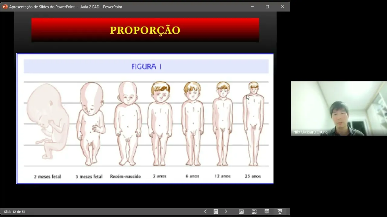 da estatura acaba diminuindo ao longo do tempo então o que que acaba acontecendo né que o tronco eh num recém-nascido é proporcionalmente maior o tronco é cabeça né é proporcionalmente maior do que em relação aos membros então por isso que esse percentual aqui depois ao longo da idade vai diminuindo que os membros vão crescendo mais proporcionalmente em relação ao restante do corpo tá então por isso que tem esse comportamento aqui então como eu falei né a proporção Observe aqui eh dois dois meses né o o feto 5 meses o feto então dois meses a cabeça