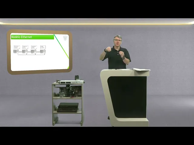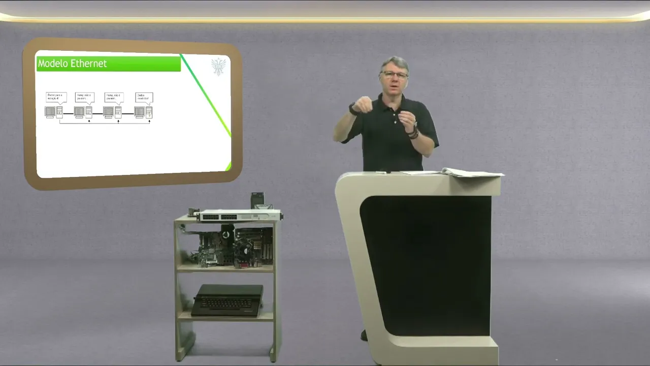né dessa imagem aí Se romper um anel ali se as duas estão passando no mesmo local as duas vão ser rompidas ao mesmo tempo então você perde essa conexão Então nesse caso o ideal é passar né esse duplo anel em outro local em outra disposição aí para poder dessa particularidade Aqui nós temos o chamado modelo ethernet né como que funciona principalmente na hora que se faz uma conexão de barramento vocês vão perceber que na ilustração que eu vou mostrar para vocês ali a eu vou sair pega um computador da extremidade esquerda ali então ele vai