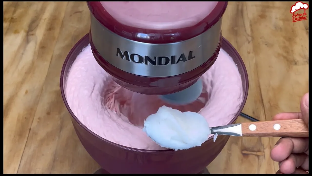 revelei o segredo das sorveterias É só colocar uma colher disso e faça o melhor sorvete caseiro em um recipiente vamos começar adicionando 500 ml de água em seguida um pacote de suco aqui estou utilizando um Sabor Morango e vamos misturar tudo isso muito [Música] bem logo após vou adicionar uma caixinha de 395 g de leite condensado vou adicionar também 200 g de creme de leite e vamos voltar a [Música] misturar após misturar vamos levar o congelador até ficar nesse ponto cristalizado ele não pode estar muito duro e vamos passar tudo para uma batedeira e adicionar