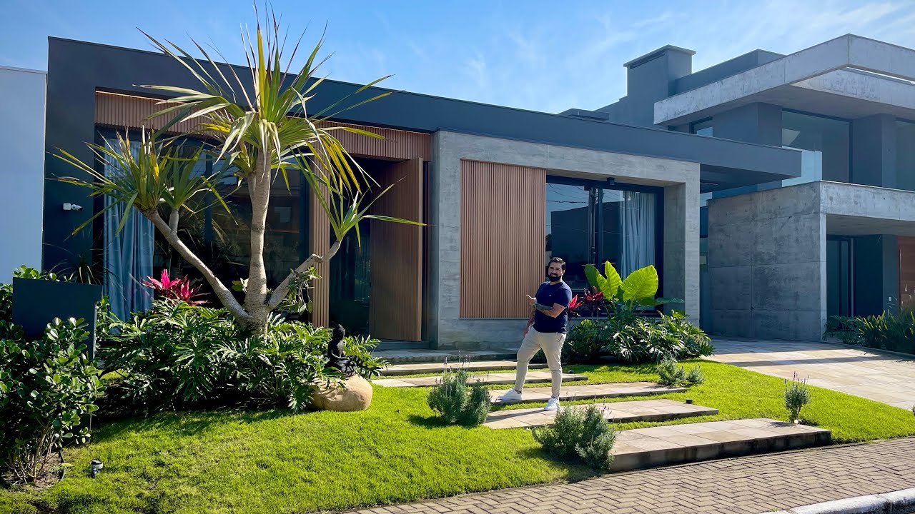 aqui mas gente vamos começar falando da fachada dessa casa que ela é impressionante os lotes o lote especificamente dessa casa é de 1000 M qu e a casa tem de construção Total 330 M então a casa é muito grande a casa é uma casa terria e ela é encantadora Começando aqui pela fachada o Paisagismo aqui ficou incrível muito legal essa parte aqui do piso as pisadas o degrau ficou muito bonito muito sofisticado a parte aqui da fachada com pedra natural que olha aí mais uma questão que a gente tá muito querendo no nosso próximo projeto