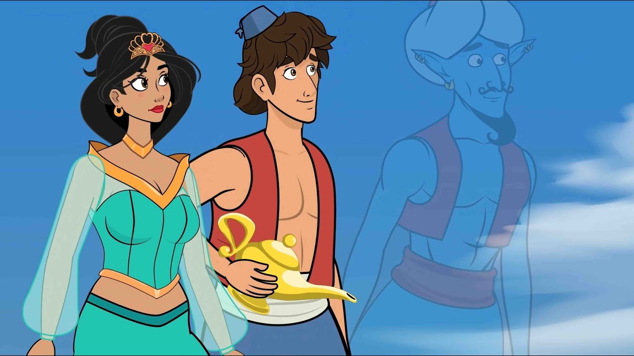 voltou para onde [Música] estava felizes Aladim e Jasmim dançavam achando que a felicidade duraria para sempre mas a lâmpada caiu no chão e se rachou e sem perceber o gênio conseguiu escapar pela fenda e saiu voando pela janela do [Música] Palácio Aladim e a fuga do gênio era uma vez um jovem bondoso de muito bom coração chamado Aladim e sua linda esposa a princesa Jasmim os dois moravam em um Palácio aos pés de uma montanha em terras muito muito distantes Jasmim estava preparando alguns snacks para aquele dia pois era um dia de doação de farinha