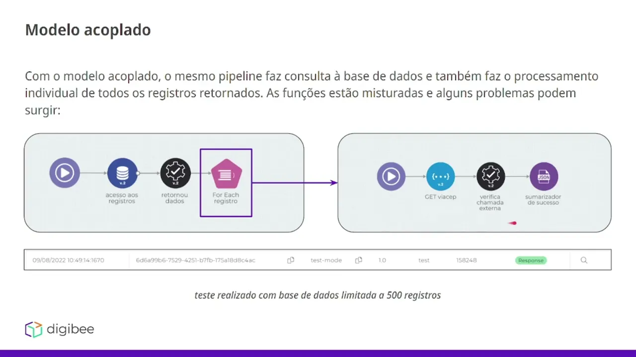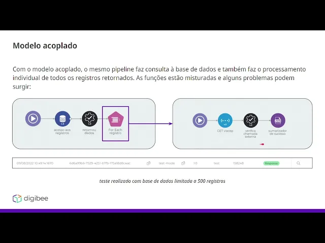 Olá esse é o bootcamp integration developer estamos na etapa de arquitetura e padrões de projeto 1 nesse vídeo falaremos sobre desacoplamento o desacoplamento ele pode ser resumido em separação de responsabilidades específicas e para entender melhor sobre esse conceito vamos ver os exemplos a seguir vamos supor que estamos observando os modelos de um aplicativo de banco para que um banco funcione ele precisa de diversos serviços que estão acoplados por exemplo preciso cadastrar novos usuários preciso fazer transações de cartão de crédito pagar contas preciso também analisar as transações de clientes então existem diversos serviços que não necessariamente tem alguma relação entre si se todos esses serviços estivessem em um único local todo aglomerado e Misturado qualquer tipo de alteração em cada um desses microsserviços teria que ser alterado em todo o projeto a ao mesmo tempo isso é um problema porque caso alguma parte específica precise de manutenção ou precise de uma melhora todo o processo vai ter que parar enquanto há essa manutenção específica para entender melhor sobre esse esse exemplo vamos pegar um modelo acoplado e um modelo desacoplado diretamente na plataforma Então vamos aplicar esse conceito diretamente nos pipelines então com modelo acoplado o mesmo pipeline faz consulta a base de dados e também faz o processamento individual de os registros retornados as funções estão misturadas e alguns problemas podem surgir então no caso seguinte temos um pipeline que possui uma base de dados que tá sendo consultada e para cada dado retornado dessa base nós temos um forit que faz um processamento e o processamento é apenas fazer uma requisição web e logo depois fazer um sumarizados nesse caso aqui nós limitamos a base de dados a 500 registros então aqui dentro do nosso forit 500 chamadas hash seriam feitas em uma única execução qu a gente olha para essa execução temos aqui o tempo de execução então para 500 registros a execução desse pipeline Demorou 2 minutos e 38 segundos isso pode se tornar um problema com o aumento da nossa base de registros aqui caso tivéssemos por exemplo 3. 000 ou 3. 500 registros já seria o suficiente para disparar o erro de timeout no pipeline o erro de timeout ocorre quando a execução de um pipeline Independente de qual seja ultrapassa 15 minutos a plataforma tem uma limitação de execução que é de 15 minutos após esse período todos os pipelines resultarão em timeout então Aqui estamos limitados à volumetria para que o fluxo dê certo se a gente olhar para um caso de pipeline desacoplado esse problema resolvido então com o modelo desacoplado o único pipeline será responsável por fazer a consulta a base de dados e outro será responsável pelo processamento individual por execução de cada registro Então temos aqui um pipeline responsável pela consulta dos registros e publicação de eventos e vemos que a lógica é a mesma temos uma base de dados e para cada registro retornado temos um forit que vai fazer o seguinte aqui substituímos o processamento com uma chamada hash por um evento event publisher que vamos publicar um evento de processamento que vai ser encaminhado pro event broker e O Event broker vai entregar essa mensagem para esse pipeline que é um pipeline responsável pelo processamento de eventos publicados de processamento aqui temos a chamada hash e temos os outros conectores que tínhamos anteriormente apenas de fazer essa mudança o pipeline de consulta de registros saiu de 2 minutos 38 segundos para apenas 3.