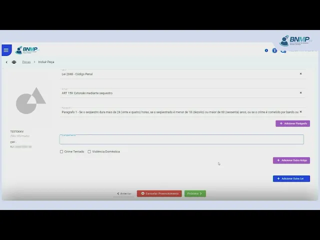 em espécie de prisão selecione conversão da temporária em preventiva informe o tipo de sigilo de ocorrência da [Música] infração selecione o número do processo a que é vinculado o mandado de prisão temporá expedido anteriormente e clique em próximo em tipificação penal Digite o número da lei o artigo e o parágrafo se houver [Música] o complemento caso seja necessário informe no checkbox se se trata de crime tentado ou violência doméstica se for necessário acrescentar outro crime previsto na lei anteriormente digitada utilize o botão mais adicionar outro artigo se for preciso lançar crime previsto em lei diversa