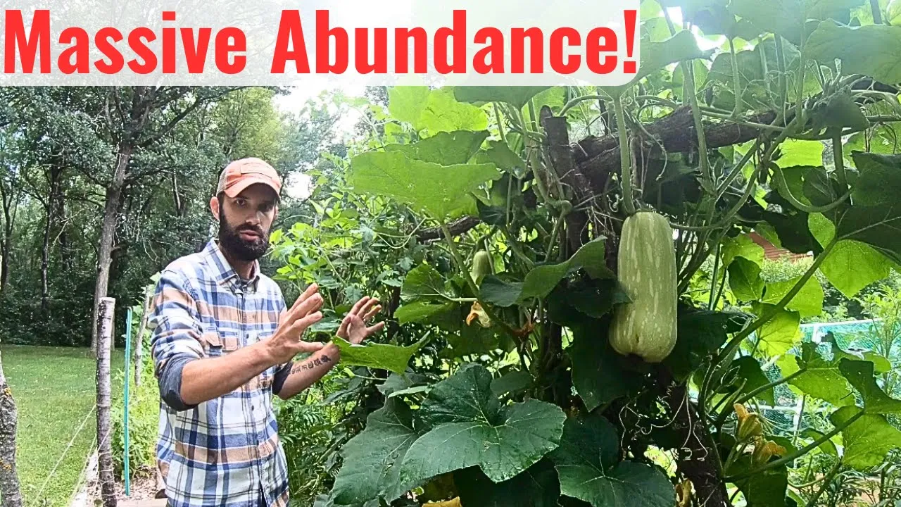 to keep growing until the end of the season they just keep going and going and going so if you look here we've got really nice healthy tomatoes so that is growing up here all the way to the top you have a whole bunch of little butternut squashes growing again over here you can see one over here growing this is what they look like when they're small the flowers falling off right there but then when they're big you get to a much nicer size that you would think of when you see a butternut squash like this