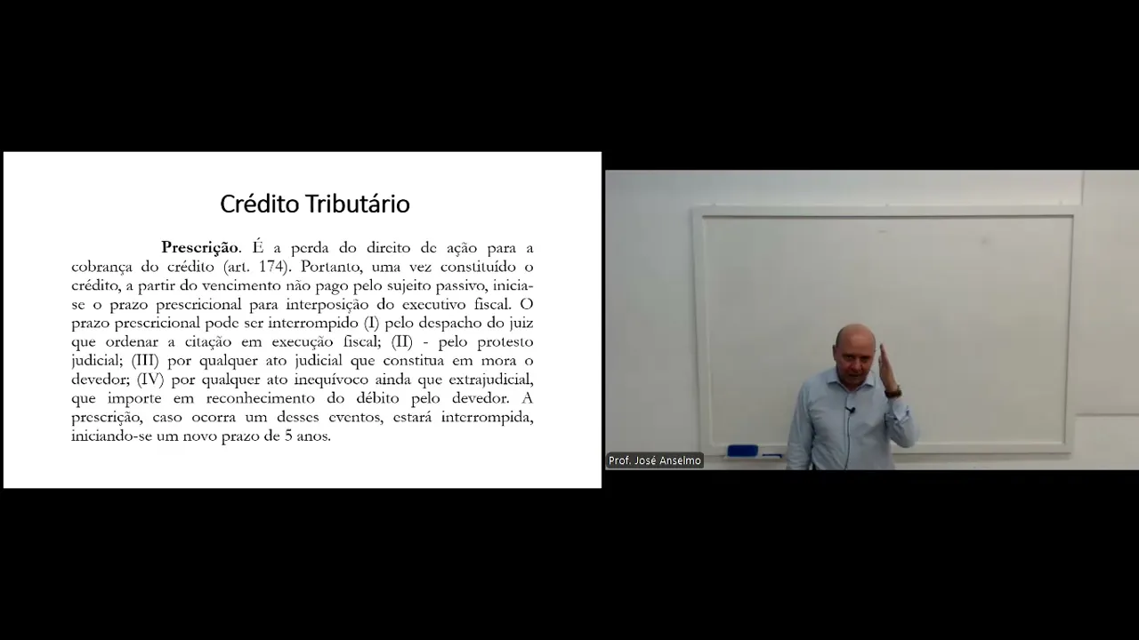 certidão positiva de débito mas com efeito negativo tá aí ela faz o seguinte ela vai até a Receita Federal e ela pede um parcelamento quando a empresa pede o parcelamento aquele pedido de parcelamento ele funciona como uma confissão de dívida E aí se tava correndo a prescrição automaticamente ela é em interrompida isso é a hipótese portanto de interrupção da prescrição tá qualquer ato que o devedor que o contribuinte faça em que ele reconheça perante o poder público ou perante o judiciário que ele é devedor interrompe a prescrição e por fim uma questão um pouco mais
