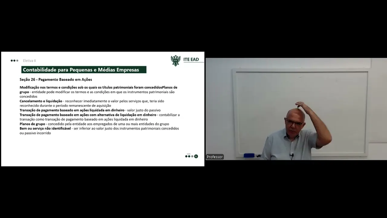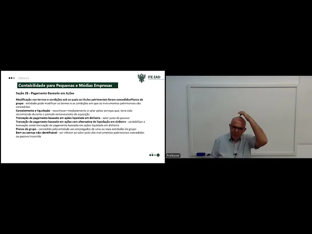 Olá continuando as aulas da disciplina eletiva 2 do curso de ciências contábeis vamos abordar eh dando continuidade a contabilidade para pequenas e médias empresas a nbct TG TG 1000 Nesta aula abordaremos as sessões de 24 a 28 subvenção governamental custo de empréstimos pagamento baseado em ações redução ao valor recuperado de ativos e benefícios a empregados gostaria de antes de dar continuidade deixar um recado eh essas aulas que temos abordando a nbct G1000 eu estou procurando fazer fazer um resumo dos principais aspectos Caso vocês venham a trabalhar espero que venham e é necessário um estudo mais