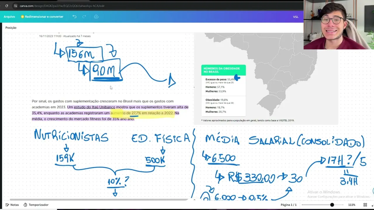 agora existem pessoas que realmente tem a necessidade Por questões fisiopatológicas de ter um acompanhamento com um profissional e isso é em torno de 90 milhões de pessoas no nosso país Além das pessoas que claro vai falar que que não é mentira todo mundo quer ter um corpo estético e um corpo saudável certo então o mercado Ele tem muita muita gente querendo seu serviço e e uma prova disso é que em dois aninhos dois aninhos se a gente for pensar desde 2020 eu tenho certeza que esse número chega a praticamente 50% nosso mercado cresceu quase 30%