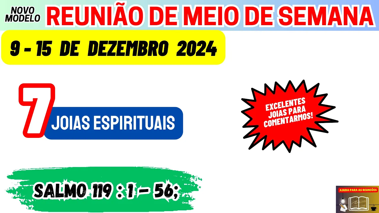 sejam bem-vindos amados irmãos ao nosso canal ajuda para as reuniões Esperamos que todos vocês estejam bem e tenham tido um excelente fim de semana meus queridos na reunião desta semana 9 a 15 de dezembro nós estaremos considerando a leitura do Salmo 119 versos 1 a 56 esse texto é a base de toda a reunião e como de costume Neste vídeo nós vamos fazer uma breve análise e preparação de algumas joias espirituais que podemos encontrar nesta leitura portanto para aqueles que ainda não fizeram se inscrevam no nosso canal deixem um gostei faça um comentário quando você