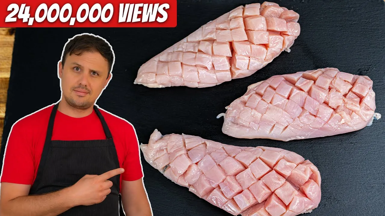 with Sophie that's a little bit easier for me to say not sure where you're from Sophie but you have a confusing name and this is one of her most popular recipes with these chicken breasts with this sort of crazy weird pattern I want to find out what's going on with that it's titled it's so delicious that I cook it almost every day incredible fast and easy okay here we go and we're off and she's making the slices I don't know if she's cutting the chicken like this just to get a good looking thumbnail or for