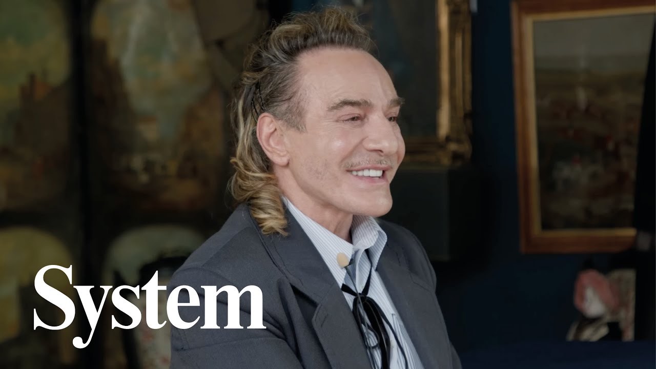 [Music] John you have welcomed system and some very special guests to this space which is your creative inner sanctum at Miss Mella here on plun um this is your Aral workspace where your creative process unfolds and where your ideas come to life we are joined by um eight students ma fashion design from colleges around uh Europe and the UK we're also joined by two people who mean a lot to John um his Muses uh Valentine and Thomas um thank you guys and I think I'm going to start by asking you um what is your relationship