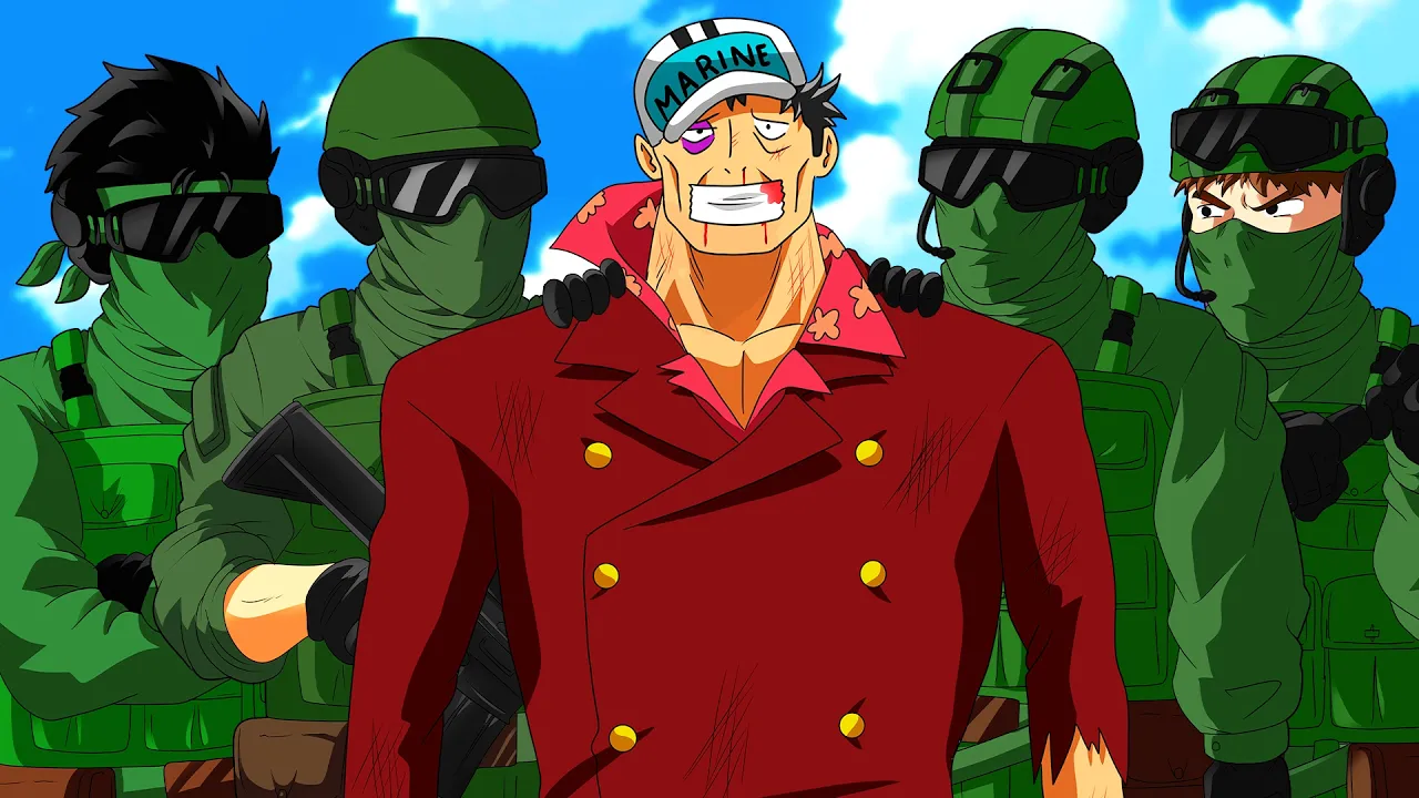 Marines on the battlefield rely on fruits for strength which isn't ideal considering the Army's water strategies however we also have to remember that these guys are all incredibly fast and strong even without out their fruits so even if they get wet I still believe they would be able to continue fighting and cause huge casualties for the Army and then there is Garb who would be at full strength due to not having a devil fruit and could easily delete a huge chunk of the military with a single Galaxy impact with these five here the other Marines
