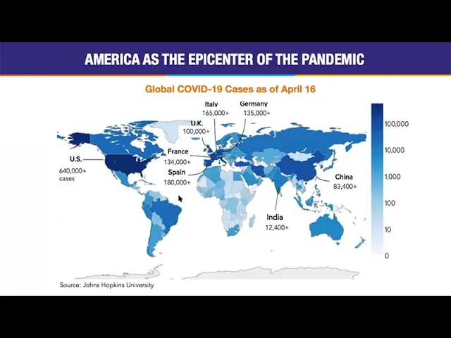 this was an Asia problem this was a Wuhan district and province issue and of course we know by now if I go to This next slide and we really fast forward to the current how dramatically things change so we went to Asia being the epicenter of the pandemic to Asia leveling out and the United States in America being the epicenter of the pandemic in just a very very short period of time we're now at six hundred forty thousand cases of course Europe has been overrun with cases but there is a really interesting country here that
