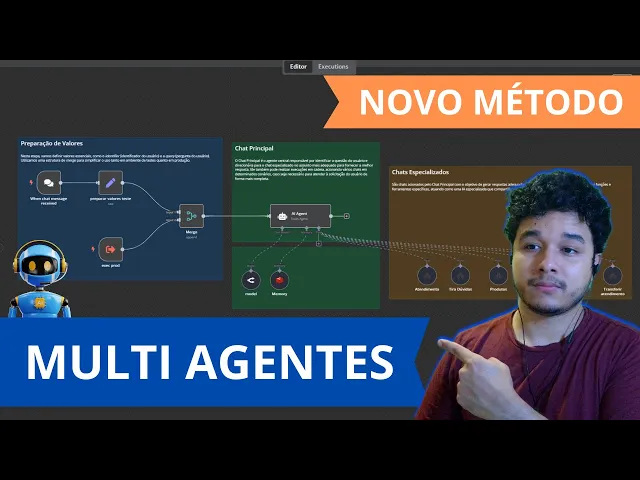 Vamos falar aqui então de multiiagentes. Já quero ir adiantando vocês que esse vídeo aqui é para quem realmente quer aprender a criar um chatbot que realmente seja profissional. Então aí se você tá querendo criar um chatbot que apenas seja para poder tirar dúvidas ali dos seus leos, do seu cliente, fazer aquela conversinha, oi tchau, tenho isso, tenho aquilo, esse vídeo aqui não é para você, pois aqui você vai aprender como é que a gente consegue aqui criar toda uma equipe de atendimento, onde você vai ter um agente especializado ali pelo atendimento inicial, descobrir o que