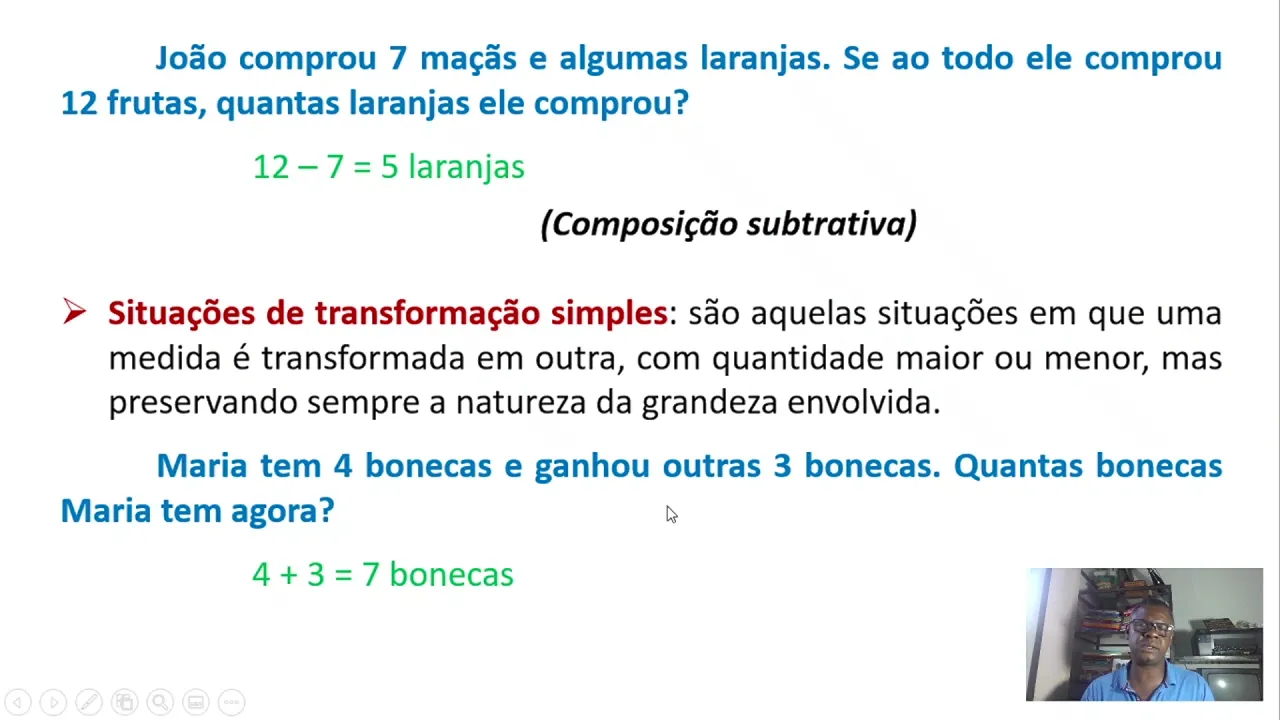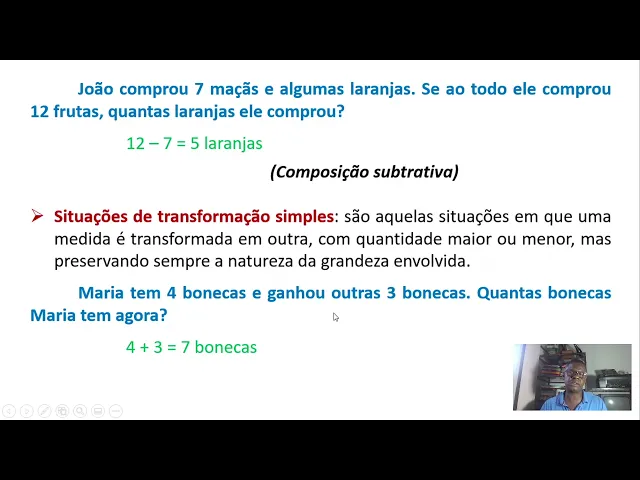 aplicação da estratégia e verificação desenhar 12 a 12 frutas e dessas eliminar 7 chegando e contando SIM neste caso aqui eu tenho uma composição subtracting a próxima é situações de transformação Simples então nessas situações são justamente as que têm uma medida em que uma medida é transformar em outra cor Quantidade maior ou menor mas preservando sempre a natureza da grandeza envolvida então também eu não vou transformar uma coisa em outra eu vou transformar uma das propriedades bom E no caso que seria a quantidade o exemplo Maria tem 4 bonecas e ganhou outras três bonecas quantas