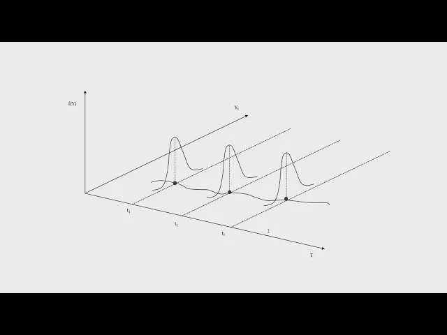 ilustrar esse conceito com o gráfico e esse gráfico estamos analisando aqui ó a trajetória temporal de Y para cada momento do tempo temos uma observação de Y por exemplo no período T1 ocorre uma realização específica de y que pertence a um processo estacionário isso quer dizer que y un que a realização de y no tempo um é uma mostra temporal que pertence a um espaço de probabilidades que contém inúmeros outros valores possíveis para Y assim como nos períodos T2 e T3 e a ligação dos pontos de y ao longo do tempo descrevem a série temporal
