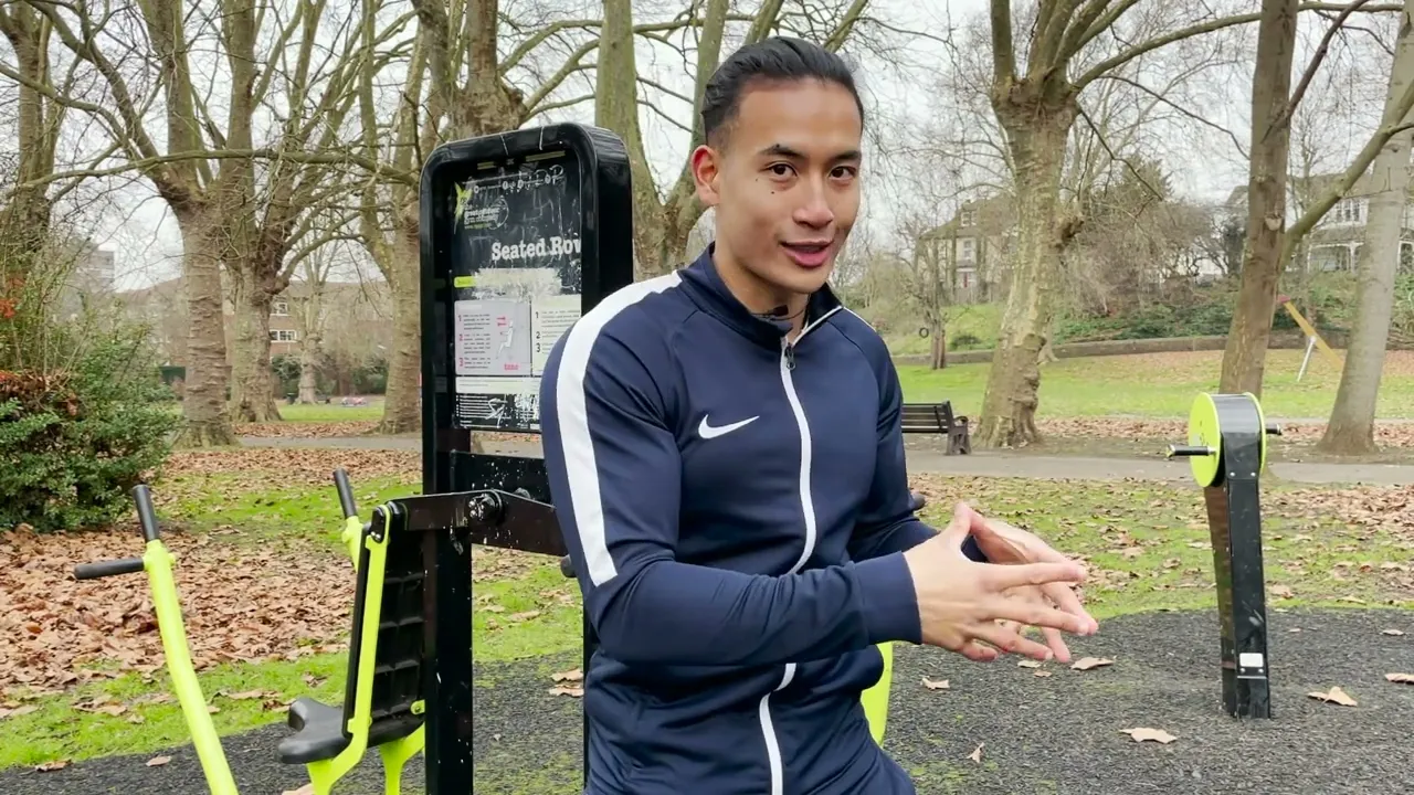 fully to push your body away from the bar keep your core tight your body rigid let's do five reps together one two three four and five up next we'll be training legs so this will predominantly target your quadriceps your hamstrings and your glutes so you want to stand tall in front of a stable surface in front of you grip it tightly feet about hip width apart then we're going to lower it down as if we're lowering down into a squat low down as low as possible and then push back up using your arms to support