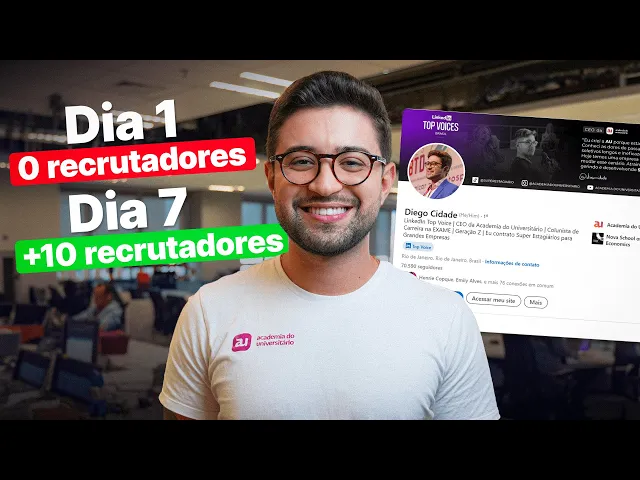 abordou bom eu sou Diego cidade se e fundador da Academia do universitário e eu ajudo a empregar milhares universitários ali Via Grande programas de estágio como da Volkswagen da TIM da mancu vav por aí vai primeira coisa de tudo antes de abordar você precisa ter um LinkedIn bom aqui exemplo rápido mas as palavra-chave a foto o banner deixa as coisas estruturadas a bio porque cham atenção mostra ali que você tá realmente com um perfil atualizado e tal Porque aí vão realmente ler então se tiver com a foto zoada e tal você vai acabar sendo descartado