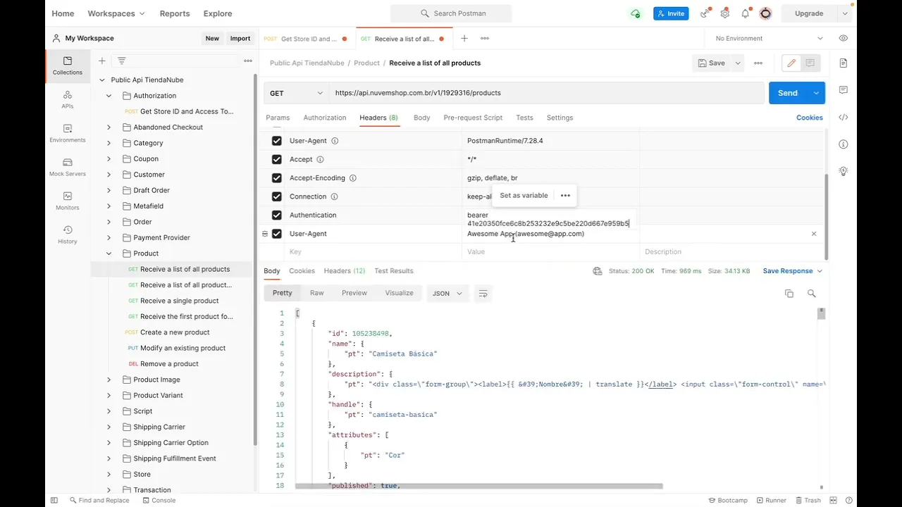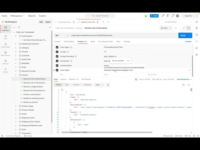 scopes that you previously selected for your application and finally the store id that you're going to use in every request you make to our api and now if you would like to make a request to the product endpoint you first select the get method here here in the url you replace the variable store id by the actual store id of your store here in the header section you uh add a key called authentication and a value bearer app token this this app token here is the access token and hit enter now you should have access