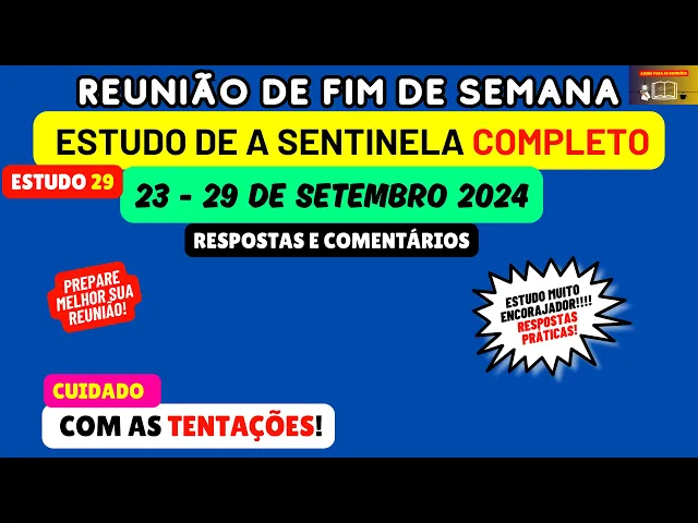 Neste vídeo vamos de maneira objetiva analisar e preparar o estudo 29 da revista Sentinela esse artigo vai ser considerado na reunião deste fim de semana 23 a 29 de setembro Portanto vamos ver que respostas práticas podemos comentar [Música] então o tema do estudo 29 é uma afirmação cuidado com as tentações tem como base Mateus Capítulo 26 Versículo 41 mantenham-se vigilantes e orem continuamente para que não caiam em tentação o que vamos ver neste estudo qual vai ser o objetivo dele vamos entender a importância de evitar o pecado e os passos que levam a ele parágrafos