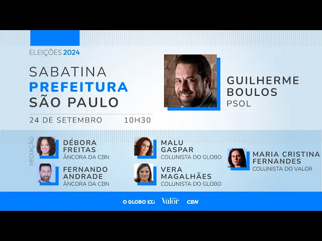 d800 FM 90,5 MHz São Paulo na internet cbm.com.br em nosso aplicativo e nas plataformas de poast cvm [Música] [Aplausos] [Música] [Aplausos] [Música] Sabatina CBN O Globo e [Aplausos] valor Olá muito bom dia seja bem-vinda Seja bem-vindo a mais uma Sabatina promovida em parceria com jornais do Globo e valor e Valor Econômico encerramos hoje na verdade a série de sabatinas com os cinco candidatos à prefeitura de São Paulo mais bem colocados na pesquisa de intenção de voto e hoje quem está conosco aqui nos estúdios da CBN é Guilherme boulos do PSOL muito bom dia candidato seja