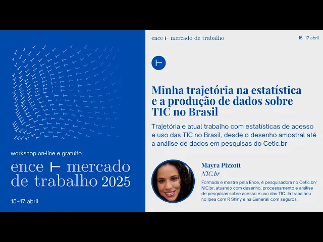 E aí, esse curso é um é um curso que eu vou também falar mais no final, mas que é sobre amostragem. Eh, e aí por isso que no meu título tá sobre produção de estatístic de estatísticas TIC no Brasil, que é o que eu trabalho hoje. Tic, para quem não sabe, quer dizer tecnologias de informação e comunicação.