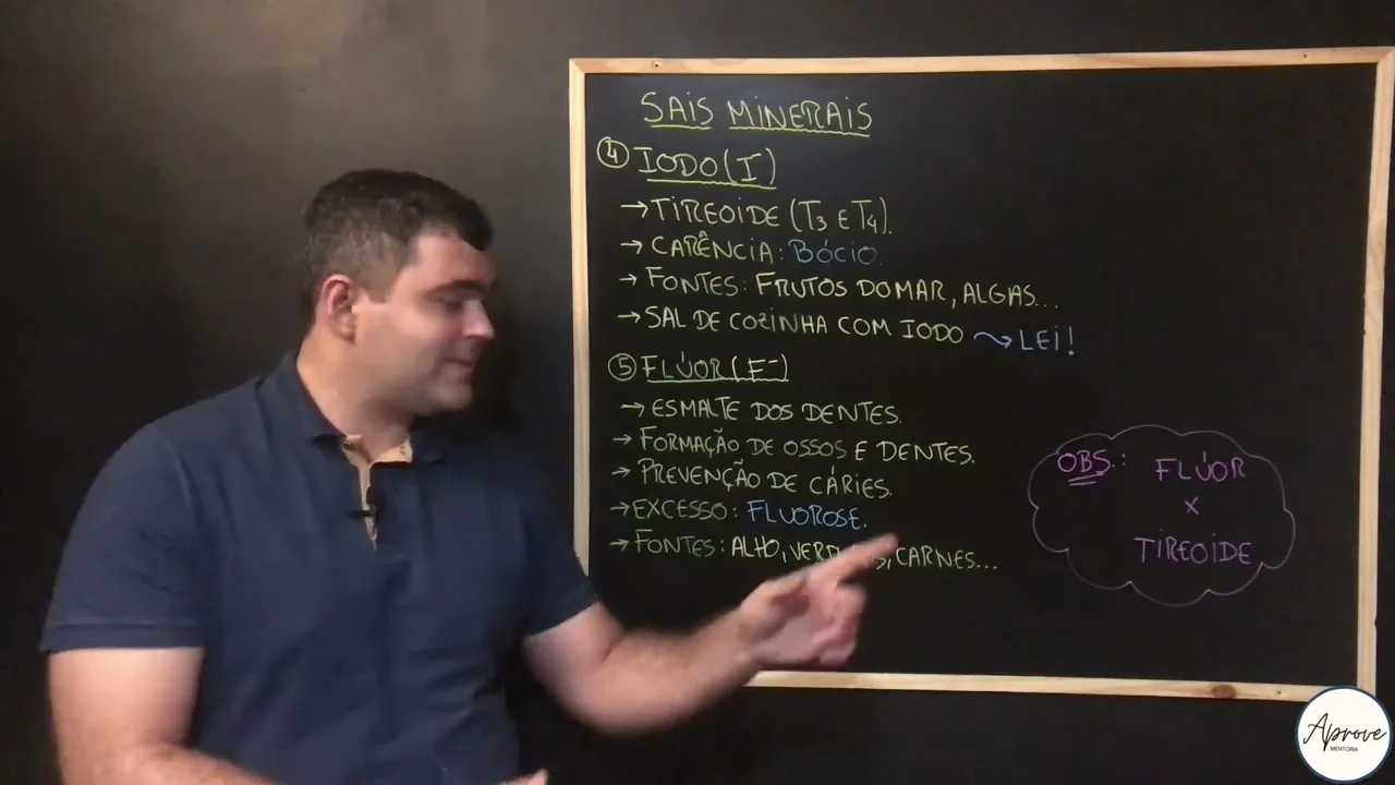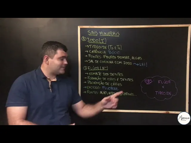 [Música] Fala galera ligada numa prova de mentoria tudo bem com vocês Professor Pedro aqui na área seu professor de biologia do projeto dando continuidade nessa vídeo aula ao estudo dos nossos sais minerais é pessoal sal mineral é coisa para caramba tá parece bobagem tudo mais mas tem bastante coisa importante para a gente ver e dando continuidade nesse vídeo vamos falar de mais alguns começando aí pelo iodo iam e menos O iodo ele é muito importante para nossa glândula tireoide uma vez que o iodo ele é componente dos hormônios tireoidianos T3 e T4 que são muito