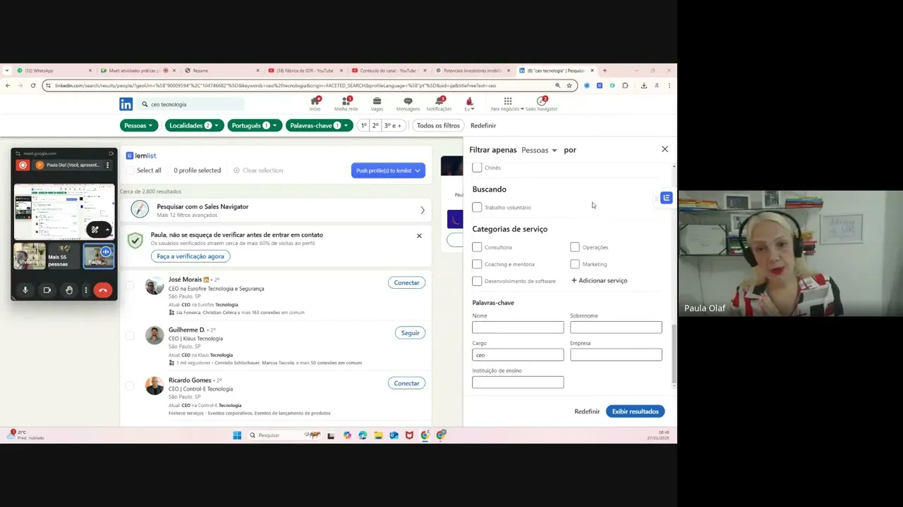 Tá então vamos aqui no primeiro investidores individuais legal sou uma bdr Meu chefe me mandou agendar com potenciais investidores para eu conseguir oferecer os nossos Empreendimentos Caraca onde eu vou arrumar essa galera bora Ah o meu empreendimento custa R 1 milhão deais cada cada apartamento é apartamento de luxo prêmium numa região Nobre Quem compra isso meu pessoas de empresas maiores se de empresa caramba preciso montar uma lista Vamos para o nosso amigo LinkedIn tô falando o quê CEO de empresa tô falando de diretor de empresa Olha quem não conhece a expressão CEO tá aqui ó