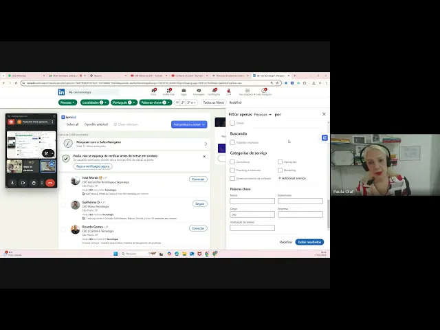 pessoas tá não estou no salos Navigator eu estou no Linkedin mal gratuito aí eu vou descer aqui que mais que eu tenho ó segue alguma página conexões de alguém várias coisas tá Dá pra gente colocar eu vou lá para baixo vou selecionar só perfil em português porque às vezes vem gringo Apesar de eu ter colocado São Paulo pode ter gringo morando em São Paulo me pode trazer Eu já coloquei lá no cargo CE Se eu quiser colocar de novo aqui ó ce e eu dou um exibir ados E aí minha gente olha coisa linda Ele