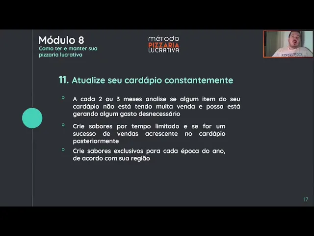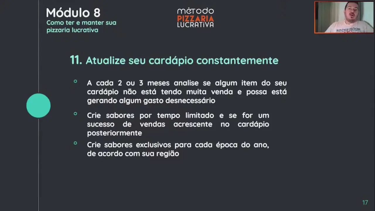 [Música] e no módulo 11 Atualize o seu cardápio constantemente isso é um dos fatores que vai fazer com que você se perpetue com a sua lucratividade eu aconselho de dois a cada dois ou TRS meses você analise se tem algum item do seu cardápio que não está vendendo muito e possa tá gerando algum gasto desnecessário ou seja algum item vemu porque não vende muito eh você tá tendo que comprar um um volume maior daquele produto e início tá imobilizando o seu dinheiro que podia tá sendo investido em outra coisa então se tiver algum item do