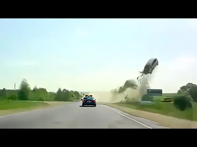 had to get this guy off the road as soon as he got permission to pit he went for it [Music] going ahead and start EMS now let's see that again from Trooper Ellis's point of view [Music] [Music] [Music] according to Ellis's report the truck dipped into a driveway Culvert causing it to flip his police cruiser went Airborne rolled several times and landed a few dozen feet away cameras inside Ellis's car show what the crash looked like from the back seat watch how loose items pop up and Float as his car Soares through the air unfortunately