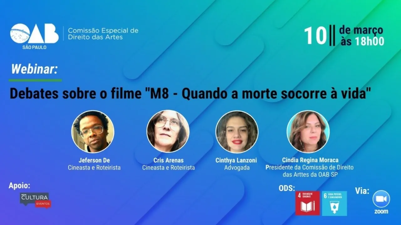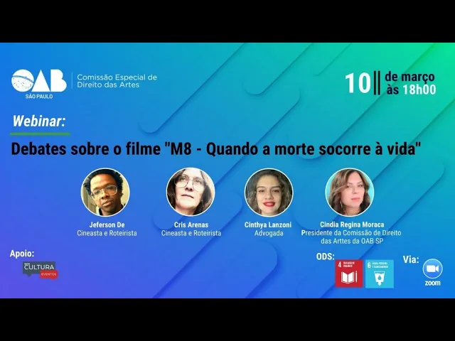 Quem assistiu não São Paulo da Ordem dos Advogados do Brasil por sua comissão de Direito das Artes tem a honra de apresentar webnar debate sobre o filme M8 quando a morte ocorre a vida evento promovido pela referida comissão com apoio da comissão de cultura e eventos da OAB São Paulo informamos que se vende compactua com os objetivos de desenvolvimento sustentável um pacto firmado entre a OAB EA ONU com a palavra Senhoras e senhores a nossa ilustre Doutora Cindia Regina moraca presidente da Comissão de Direito das Artes da OAB São Paulo O olá boa noite a