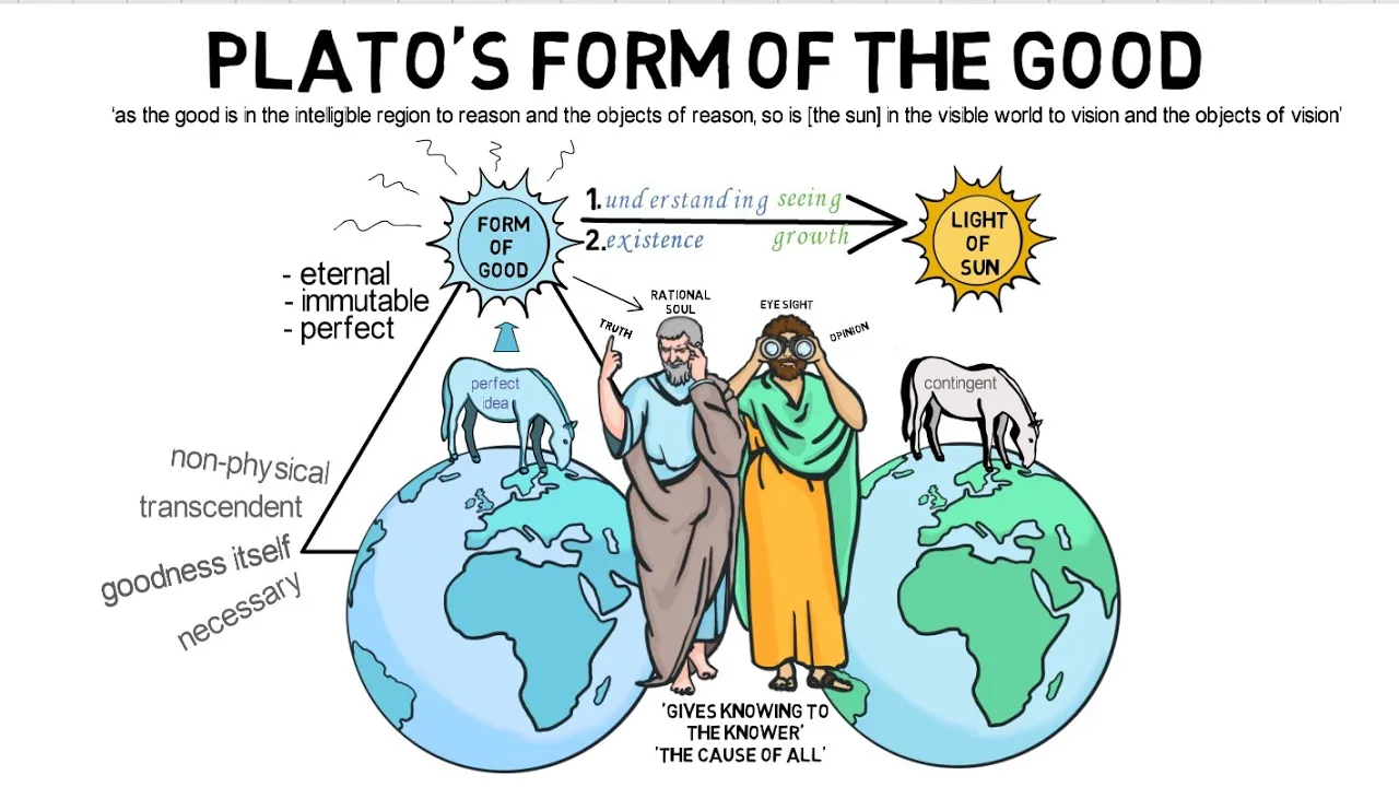 this is the third video on Plato and we're going to take a closer look at the form of the good which we mentioned in the last video about Plato's theory of forms and it was at the very top of the hierarchy if you remember being the highest form and above all and the word for that is transcendent the form of the good transcends is above and beyond everything in some ways though it's also within everything to a greater or lesser extent for example a particular horse participates in the form of horse and every form is