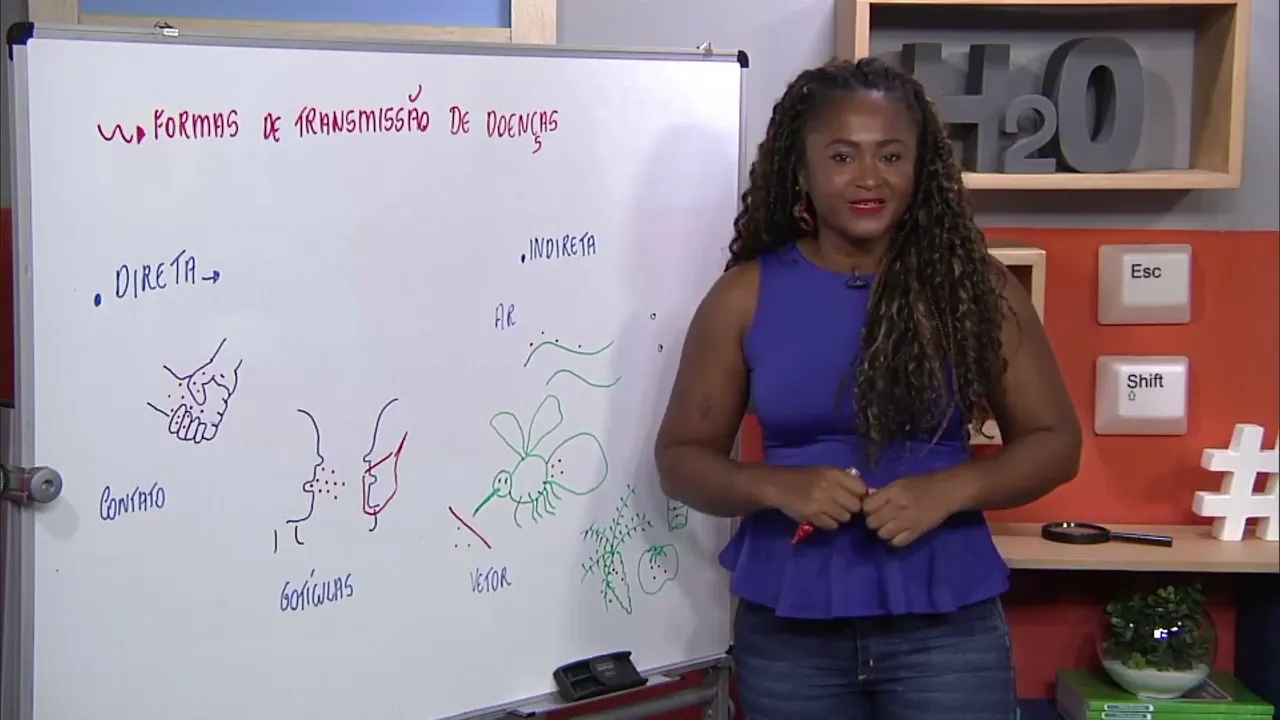 E aí [Música] E aí o Olá pessoal eu sou professora Gislaine Silva uma mulher negra usando tranças calça jeans e uma blusa azul sejam bem-vindos a mais uma aula de ciências vocês sabiam que existe cerca de 100 trilhões de bactérias vivendo no nosso corpo é isso aí pessoal e mais uma infinidade de seres invisíveis habitando o corpo de cada um de nós Como assim professor Então quer dizer que isso pode afetar nossa saúde de alguma forma pode causar alguma doença velho é o que nós veremos na aula de hoje os microrganismos EA saúde humana bem
