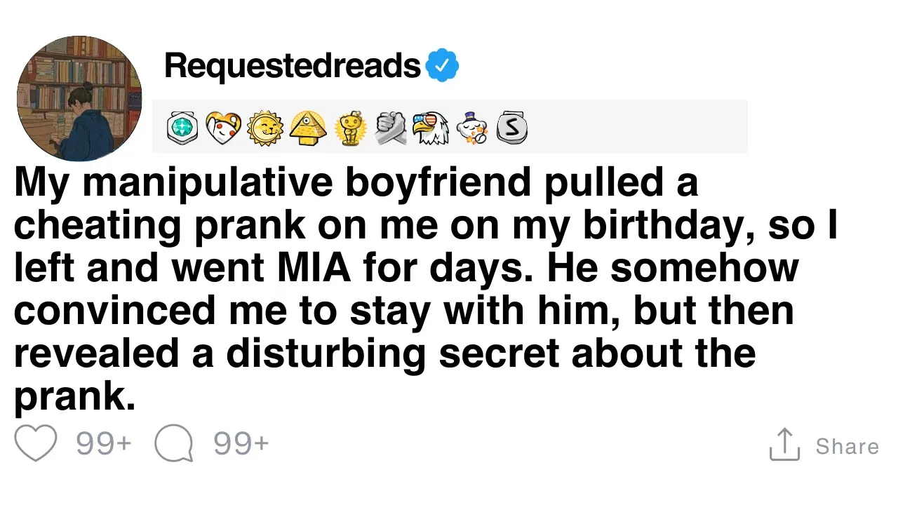 my manipulative boyfriend pulled a cheating prank on me on my birthday so I left and went MIA for days he somehow convinced me to stay with him but then revealed a disturbing secret about the prank last week was my birthday so I got off work early but when I came home I saw a random woman lying on my boyfriend when he saw me jumped up then got in between me and the door as I had turned around to leave it's just a prank sweetheart he said and out of nowhere 10 of his friends came downstairs