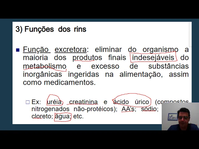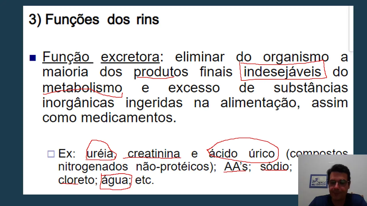 úrico e é a discreta é um produto metabólico da degradação dos das bases nitrogenadas do dna e rna além do que na urina não tem só as excretas você tem também a eliminação de aminoácidos você tem eliminação de sódio potássio cloreto e o balanço mais importante que é quanto de água que eu devo tirar o organismo pela urina é como é que eu faço para avaliar se um rim está bem ou se houve não está bem se ele está desempenhando ou não sua função adequadamente eu vou fazer testes da função renal também é o primeiro