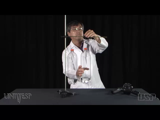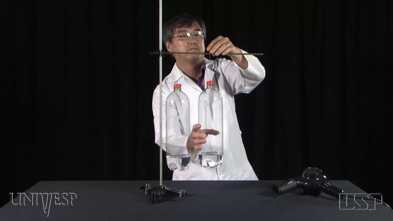 [Música] para fazer uma demonstração do fenômeno de ventu usaremos um secador de cabelo duas garrafas PET contendo um pouco de água e um suporte para iniciar o experimento as garrafas devem ser penduradas próximas uma da outra em seguida usaremos o secador de cabelo não é necessário ligar a resistência elétrica para aquecê-lo o secador será usado apenas como uma fonte de Vento soprando ar entre as duas garrafas ao fazer isso ao contrário do que se espera quanto mais vento é soprado entre as garrafas mais elas são atraídas Isto é explicado pelo princípio de ber Il que