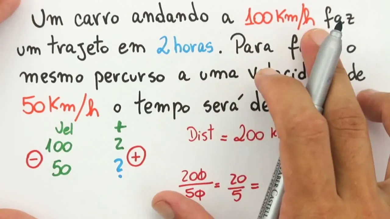 dividir isso aqui por 50 certo então 200 vamos dividir por 50 que que dá para fazer aqui simplificando né corta 0 e z0 é a mesma coisa que dividir 20 por 5 isso vai dar igual a 4 ou seja 4 horas então retomando aqui a Velocidade diminui o tempo deve aumentar para andar o mesmo percurso nesse caso aqui lá da física né 100 km/h um trajeto de 2 horas então qual é né o trajeto que ele tem que fazer a distância que ele percorre é de 200 km porque ele anda 100 Km a cada hora