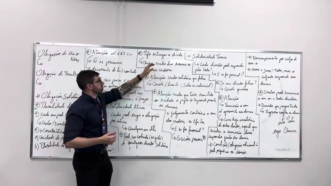 Fala galera sejam bem-vindos a mais uma aula de direito civil obrigações hoje nós vamos falar de responsabilidade solidária temos um quadro repleto de informações mas eu quero algumas coisinhas iniciais responsabilidade solidária turma ela é de suma importância sobretudo por quê Porque ela é praticamente utilizada em várias relações ao longo da nossa vida só que a gente às vezes nem identifica Então vou trazer algumas regras como funciona e todas as nuances que são importantes para a prova e pra sua prática antes de adentrar especificamente Vamos só retomar a última aula que tinham dois tópico zinhos que ficaram ali faltando vamos lá obrigações de meio e obrigações de resultado rapidão obrigações de meio é naquela obrigação da qual a p se dispõe a fazer algo mas o resultado em si não é parte da obrigação por exemplo quando tu tens ali a questão de um advogado a contratação do advogado é para que ele lute na defesa dos seus direitos mas ele não pode lhe garantir o resultado então é uma obrigação de meil eventual responsabilidade civil só pode ser né imputada a ele quando de algum ato de desídia quando ele agiu de alguma forma ali negligente com o processo sobre o fato de ser improcedente não mas a falta de cuidado com o processo sim porque daí é responsabilidade de meio no caso da responsabilidade de resultado aí não é a questão do resultado final tu queres aquele resultado tu quer o resultado final que tu tá alhe contratando justamente para aquela finalidade por exemplo tu tá contratando uma questão de uma cirurgia plástica então o objetivo é que tu fique daquela forma então tu tens um objeto final ah eu quero uma pintura Eu quero uma entrega de um armário então uma uma obrigação de resultado porque eu quero um objeto final eu tô contratando para a entrega do objeto final beleza aí no caso de falha no caso de alguma coisa diferente aí tu podes buscar a responsabilidade civil relacionado ao resultado Ok respira vamos lá obrigação solidária primeiro ponto vamos entender que a solidariedade esse termo bonito vai trazer uma ideia de corresponsabilidade Ou seja eu tenho uma pluralidade de partes tanto no polo ativo quanto passivo e aqui nós vamos chamar de credores polo ativo devedores polo passivo nesse caso guarda entre eles existe entre eles um dever de corresponsabilidade sobre a dívida e também de possibilidade uma co intimidade para que tantos os credores tantos credores fossem quantos sejam eles tem 10 tem C qualquer um deles pode exigir o todo da dívida dos devedores bem como os devedores qualquer um deles se responsabiliza pelo todo então prestem atenção nisso aqui a título de provas é muito importante a gente destacar as características quais são elas unidade de prestação eu posso cobrar o todo de qualquer um deles pluralidade dos sujeitos pluralidade ativa credores pluralidade passiva devedores corresponsabilidade dentre eles existe ali uma responsabilidade Onde eu posso acionar um posso acionar dois posso acionar todos então existe ali uma corresponsabilidade inclusive ess salutar pontual o seguinte a nível de processo civil a forma da qual eu quero chamar todos esses codevedores corresponsáveis é chamado de chamamento ao processo professor dá um exemplo tá muito difícil claro vamos lá imagina o seguinte tu tens ali um devedor um contrato simples de aluguel vamos pegar no nosso dia a dia tem ali num contrato de aluguel a figura da pessoa que está entrando o inquilino e aí normalmente vem lá no final assim fiador quem é o fiador é um codevedor Então se eventualmente o inquilino não pagar o aluguel pode o proprietário buscar a cobrança daquele valores tanto do devedor principal quanto do fiador ou dos dois porque é uma relação obrigacional solidária outro exemplo imagina o seguinte tu comprastes um carro esse carro foi adquirido numa concessionária e tinha um problema estrutural por ser uma relação de consumo tu pode acionar tanto a concessionária que te vendeu como também a montadora Porque existe ali uma responsabilidade solidária em razão da relação de consumo tranquilos e cocredores quem são essas pessoas que podem exigir pensa o seguinte tu tens ali uma sociedade ou então uma associação ou um grupo de pessoas que fizeram ali um contrato melhor temos uma uma um grupo um coletivo de pessoas que fizeram um contrato para determinado tipo de atividade Então vamos pensar fizeram ali pra questão de um show então pagamos nós somos empresários fizemos aqui um contrato para que esse grupo Empresarial contratasse Wesley saf para realizar o show e aí colocamos lá cláusula tal quanto que foi o valor pago ali de forma antecipada e uma multa uma multa de 1 milhão e somos cinco pagamos 200 ali de forma antecipada veja qualquer um desses credores poderá cobrar essa multa caso o nosso Wesley safad Diones não venha fazer o show por quê Porque nesse caso essa pluralidade de credores dentro da Constituição solidária ou seja eles vão colocar que é uma responsabilidade solidária qualquer um desses credores pode cobrar o todo então vejam se eu tenho uma solidariedade ativa qualquer um dos credores pode cobrar o todo do devedor claro que se ele receber o que que nasce daí nasce a responsabilidade de passar o montante para os demais e se eu tenho uma pluralidade de devedores agora é o contrário o nosso ator o nosso cantor foi lá fez o show mas essa fadão fez o show mas nós não pagamos Então ele pode cobrar o valor residual de qualquer um daquelas pessoas que estão constituídas ali como responsáveis solidários Então pode cobrar o todo somente de um devedor de todos os devedores de dois o importante é aquele que paga tem direito de buscar os demais valores dos outros devedores Então se tem ali quatro pessoas e tá faltando 800. 000 e ele pagou tudo ele pode tirar a cota parte dele e cobrar o residual dos demais então Digamos que a gente tem ali 800 di