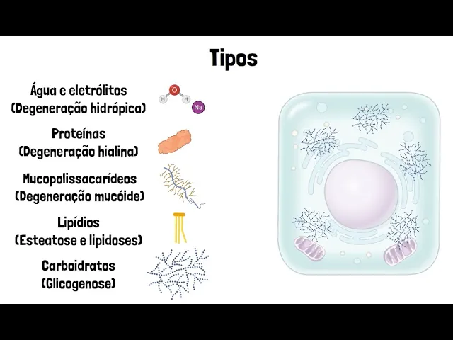 podem se acumular dentro das células EA classificação do tipo de degeneração consiste exatamente na natureza dessa substância por dentro ser água e eletrólitos ou degeneração hidrópica proteínas ou degeneração hialina mucopolissacarídeos ou degeneração mucóide lipídios ou esteatose ele doses e carboidratos público G nozes [Música] e vamos ver agora um pouco mais sobre cada tipo de acordo com a degeneração hidrópica consiste no acúmulo de água e eletrólitos dentro da célula devido a distúrbios no equilíbrio hidroeletrolítico as causas possíveis são lesões que afetam de alguma forma o transporte de eletrônicos seja afetando as bombas eletrolíticas diretamente afetando a