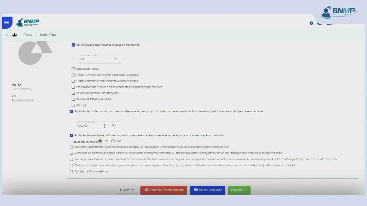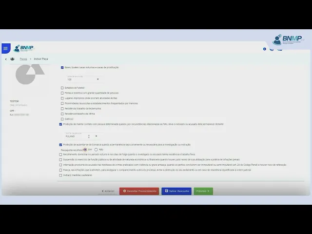 o início do período de cumprimento da medida e o fim do período de cumprimento da medida clique em próximo na aba medidas cautelares diversas da prisão selecione as medidas impostas na [Música] decisão preencha os demais Campos conforme a necessidade [Música] selecionadas todas as medidas impostas clique em [Música] próximo o sistema apresentará as informações lançadas para fins de revisão Caso haja necessidade de retificação de algum dado utilize o botão anterior o usuário poderá ainda utilizar o botão rascunho em caso de modificações que demandem o levantamento de dados não disponíveis no momento inexistindo a necessidade de alterações