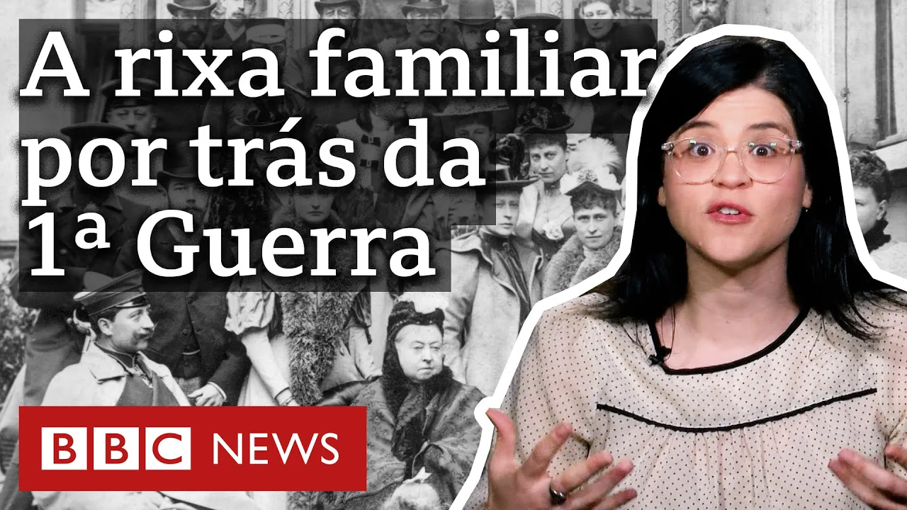Em 1914 começava o maior conflito bélico da história do mundo até então A Primeira Guerra Mundial As três principais nações que protagonizaram o conflito — Alemanha, Reino Unido e Rússia tinham mais em comum do que o fato de estarem entre as maiores potências do planeta no início do século vinte Existiam laços de família Sou Camilla Veras Mota, da BBC News Brasil, e neste vídeo eu vou mostrar a vocês como as disputas entre três primos desencadearam um conflito que provocaria a morte de dezessete milhões de pessoas, entre militares e civis Os quatro anos do conflito mudariam o mapa da Europa e romperiam laços de família Os monarcas de Alemanha, Reino Unido e Rússia eram da mesma família, a da rainha Vitória do Reino Unido, que você vê saltando da carruagem, em imagens de mil oitocentos e noventa e oito A Rainha Vitória reinou por 63 anos, até 1901, quando morreu O kaiser alemão Guilherme II, o primeiro a declarar guerra, era o neto mais velho da rainha Vitória. Seu oponente russo, o czar Nicolau II, era casado com Alexandra, outra neta de Vitória, a favorita da monarca britânica, na verdade. Guilherme e Nicolau eram primos de segundo grau de George V, também neto da rainha Vitória.
