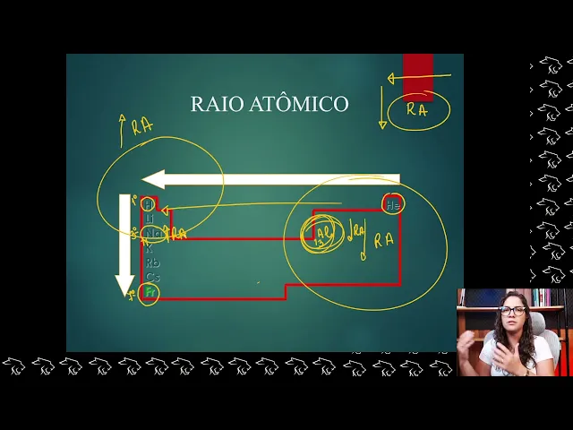 estudo aqui Essas são as principais propriedades periódicas que a gente vai ver E aí a gente começa com o raio atômico o raio atômico A gente trabalha com tamanho do átomo para ficar mais fácil de você entender né mas o raio atômico é a distância do núcleo até a última camada da eletrosfera né E aí a gente consegue identificar mais ou menos o tamanho desse átomo o bom mesmo é focar o elemento químico tem um raio grande tem um rio pequeno então a gente pensa ele é grandão ou ele é pequenininho pensa em tamanho que