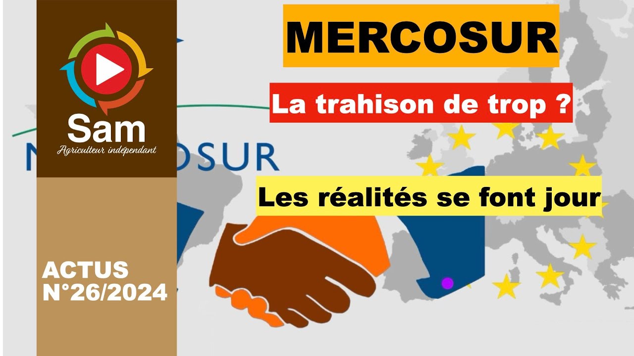[Musique] mes chers compatriotes nous sommes aujourd'hui le samedi 7 décembre 2024 et je crois utile de faire le point sur cette question qui empoisonne en fait le monde de l'agriculture ainsi que nos relations avec d'une part les pays d'Amérique latine et d'autre part la Commission européenne je veux parler de l'accord de libre échange entre l'Union européenne et le Mercosur alors je vais aller je vais essayer d' être clair dans quelque chose qui ne n'est pas forcément c'est quoi d'abord le mercosour ça s'appelle mercosour ou mercosou selon qu'on s'assoit en espagnol ou en portugais en fait