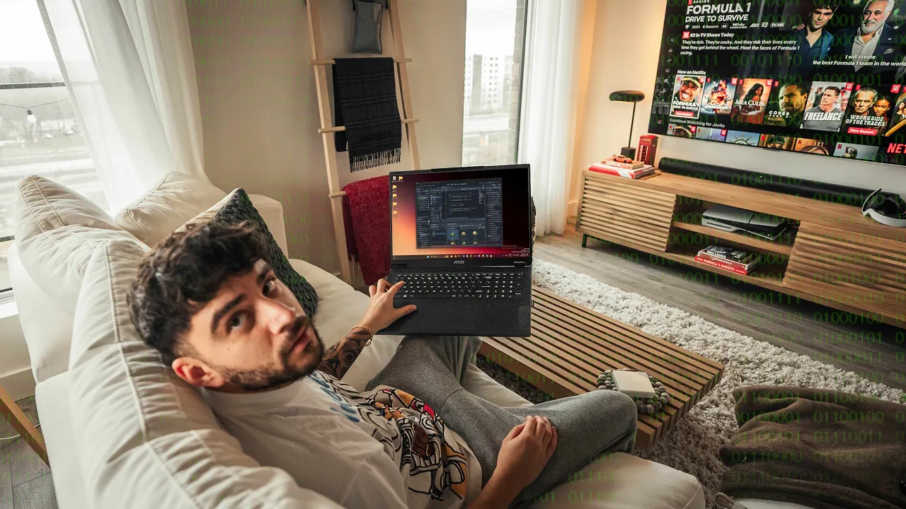 4 lb is really nice at home I just felt like I had a old monitor in front of me in my bed so it's been definitely a different experience transporting this places with me in fact I had to change my bag and because the charging brick needs to be big to juice this Powerhouse well I need a backpack with a good amount of compartments so portability is not its a strun suit but that's not not why you should buy a laptop like this a laptop like this is essential if you are the type of person that wants power wherever you go power and Screen real estate is what I've realized and I know I know some of you guys have been wondering why I've been hopping everywhere um as you guys can see I broke my ankle in tibia playing football about a month ago I think I've said that about a thousand times but it's been challenging managing work my business and personal life this isn't the first time I've been through this situ ation by the way back in high school a similar injury shattered my dreams of pursuing a career in football and it took a huge mental toll on me I felt like I lost part of myself and honestly it was one of the toughest times of my life that's why I decided it was cool to bring something up today the value of speaking to a professional therapist with today's sponsor betterhelp better help makes it easier and less intimidating for people to start therapy they match you with a licensed therapist tailored to your needs PR references and location giving you access to over 30,000 therapists in their Network this means you're not limited to the Professionals in your area you have a wide range of expertise at your fingertips and the best part is that you can start having therapy sessions in whatever format you prefer phone call video chat or even messaging for someone who's going through a tough time talking to someone who understands and can provide professional guidance is invaluable if you're feeling stuck overwhelmed or just need someone to talk to I highly encourage you to check out betterhelp go to betterhelp. com androos out to get started they'll match you with a therapist in most cases within 48 hours or less and you can switch therapists easily if you feel the need and no additional cost click that link in my description to get 10% off your first month with better help now they did manufacture this laptop with a mini LED display I like it I actually have been really liking it and I'm not sure if it's because I'm com coming from a 14-in panel which means I have more room to work with look being mini LED and not OLED is great in the sense that it's not prone to the risk of burning it's also great because I've realized it can push much higher levels of brightness when it comes to very high Dynamic ranges for gaming and for consuming media I've truly found this to be so good with a 165 HZ refresh rate cing with the voice is indeed amazing I will in fact add the same comment to watching movies on Netflix or Amazon Prime the only thing with mini LED that you need to be aware of is that when it comes to maybe working on edits whether that's uiux Work video or photos on Lightroom dimming zones can cause Halo effects or ghosting As you move elements around this mainly happens because those dimming zones will cause the brightness to move against darker zones so it can be tedious if you are someone that I don't know realizes these type of things the good news is that you can turn that off if needed know that this is also a 100% dcp3 panel and with the power it delivers it really makes editing easy to work with for me though I've been mostly just continuing my coding Journey with this laptop especially because I'm able to use Dynamic 83 HZ to 165 HZ on this panel I think for people who game need power for cat programs love to consume media content and even game and software developers this can really really deliver the same thing with this Steel series powered keyboard it delivers the only complaint I have is how the keyboard and display mesh together um wait let me explain this better sometimes when sitting in my bed for example if my RGB bar is on I can see Its Reflection at the bottom of my screen which can get annoying thankfully that can be turned off through the steel series GG software or you can completely avoid it by just really tilting your screen backwards anyways the cool thing with these type of laptops that have lots of room room under chassis and can be thicker than Ultrabooks is that companies can take full advantage of using larger components to make this keyboards feel even better this almost feels a bit like a mix of a mechanical and tactile keyboard I feel like I get full complete Strokes when typing Coden the key surface feel just right at the tip of my fingers like it's crazy smooth but also not rough to the touch it also is a perky RGB layout with a larger numpad for the programmers that enjoy using numpads this can be nice for sure the trackpad is great it's actually massive I complain every year about how MSI likes making small track bads but this one is great it's actually a 12% improvement from their stealth models in terms of enlargement that surface makes the touches feel even softer than my Zenbook and my fingers feel like it slids with ease on this surface so scrolling and just surfing for code has been completely fine that's what I'm trying to get at overall the only thing that's been a bit of a challenge for me is finding my keys especially the backspace I always hit the numb lock by accident and that's just because I'm not used to having an 18-in laptop I'm used to working so crammed and now it's like I have all the freedom in the world the other thing I wish was that I had another FN key towards the bottom left of the layout so when it comes time to lower the volume mute the laptop kill the trackpad and webcam I could do it with one hand when it comes to Ports I've got zero complaints on my end I mean with so much power I'm glad they added that SD card slot whether y