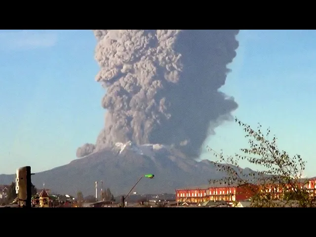 loud clap of thunder that lasted for over 30 seconds then the video shows a huge cloud of volcanic ash spewed three miles into the air turning the sky dark ash was spread across hundreds of miles of land covering cities and villages in a thick layer of ash up to 15 miles away it was the first time mount sinabung had seen any activity in over a year surrounding the pacific ocean is a long chain of volcanoes known as the ring of fire on the other side of this ring in south america lies the country of chile