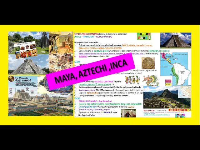 Ciao ragazzi in questo video facciamo una rapida sintesi delle civiltà precolombiane ovvero che le civiltà come i Maya gli Aztechi e gli Incas che vivevano in America prima dell'arrivo di Cristoforo Colombo si è calcolato che al tempo vivessero in America circa 40 milioni e queste popolazioni amerinde coltivavano prodotti praticamente sconosciuti agli europei come il mais le patate i pomodori cacao peperoni ma anche L'avocado la Papaia il tabacco e gli arachidi conoscevano la scrittura lavoravano i metalli preziosi come l'oro l'argento e fabbricavano anche gioielli Inoltre avevano grandi conoscenze astronomiche e matematiche famose Infatti sono le piramidi