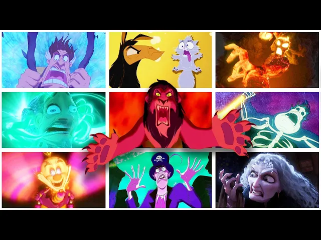 this the evolution of every Disney villain's defeat or death let's get into it starting off strong we have Queen grimilda the evil queen and wicked stepmother of Snow White who doubles as a witch the Witch cornered by the dwarfs flees in Terror but ends up trapped on a cliff desperate she tries to crush them with a boulder but karma strikes literally a lightning bolt shatters the ledge beneath her sending her plummeting to her Doom the boulder follows sealing her fate as the dwarfs watch two vultures swoop down to Feast on her remains in a desperate